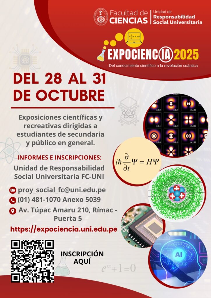 La Facultad de Ciencias de la Universidad Nacional de Ingeniería tiene el agrado de invitar al evento académico Expociencia 2025, en donde se desarrollarán exposiciones científicas y recreativas dirigidas a estudiantes de nivel secundaria y público en general.